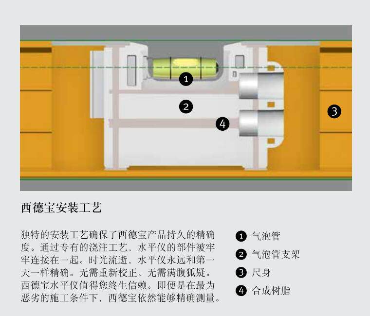 ● 西德宝安装工艺确保持久的精度 - 标准位置测量精度:±0.5mm/m,翻转位置测量精度:±0.75mm/m