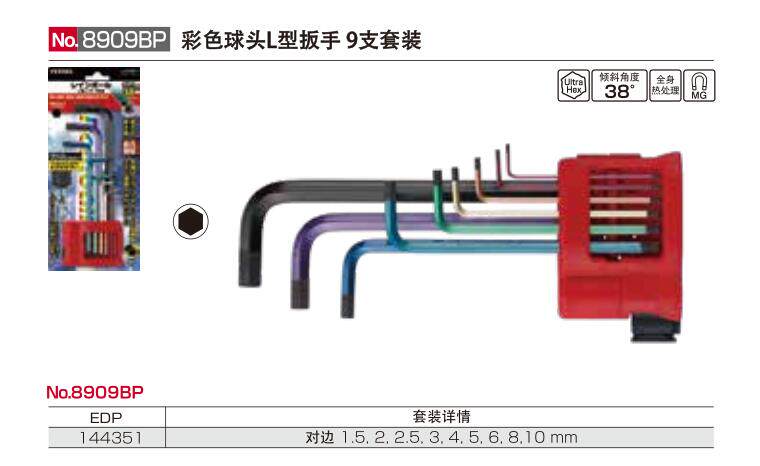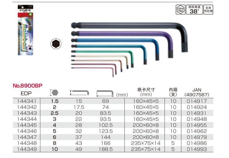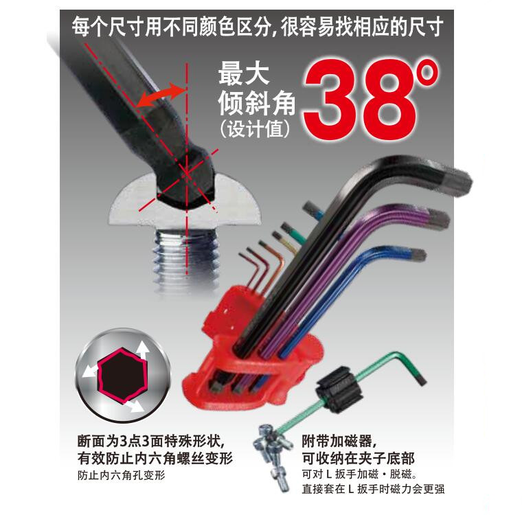 ●最大倾角约为38°。 ●前端采用不受镀层影响的高精度黑色涂层加工。 ●颜色区分尺寸便于寻找取用,采用不易剥落材料涂装。 ●截面采用3点3面接触的“六面体”设计,减少螺丝孔变形的风险。1.5除外