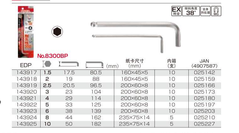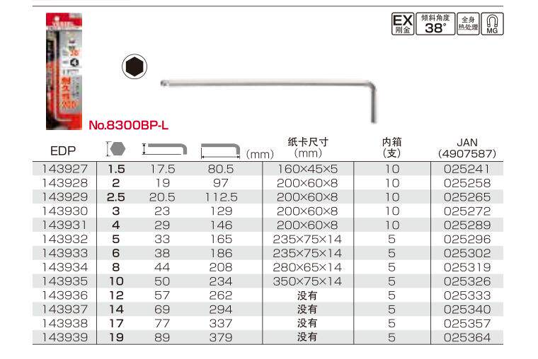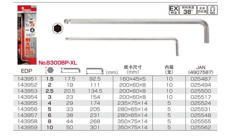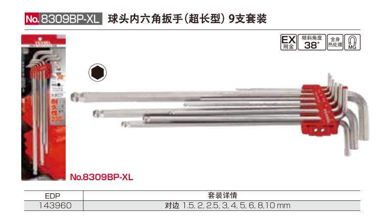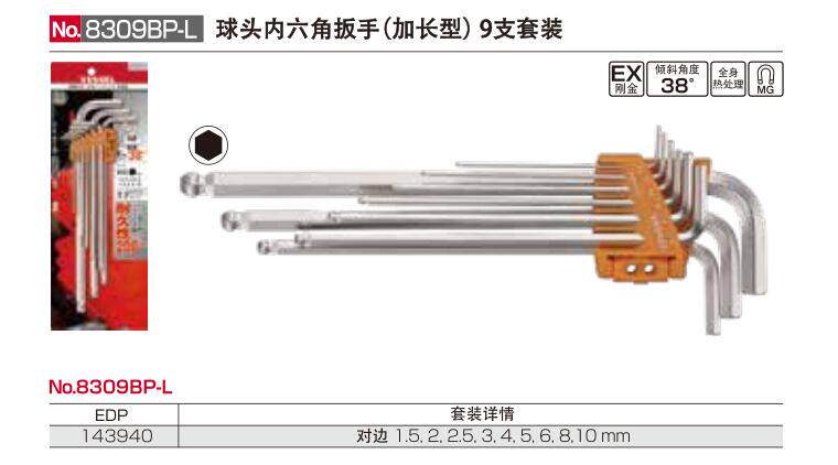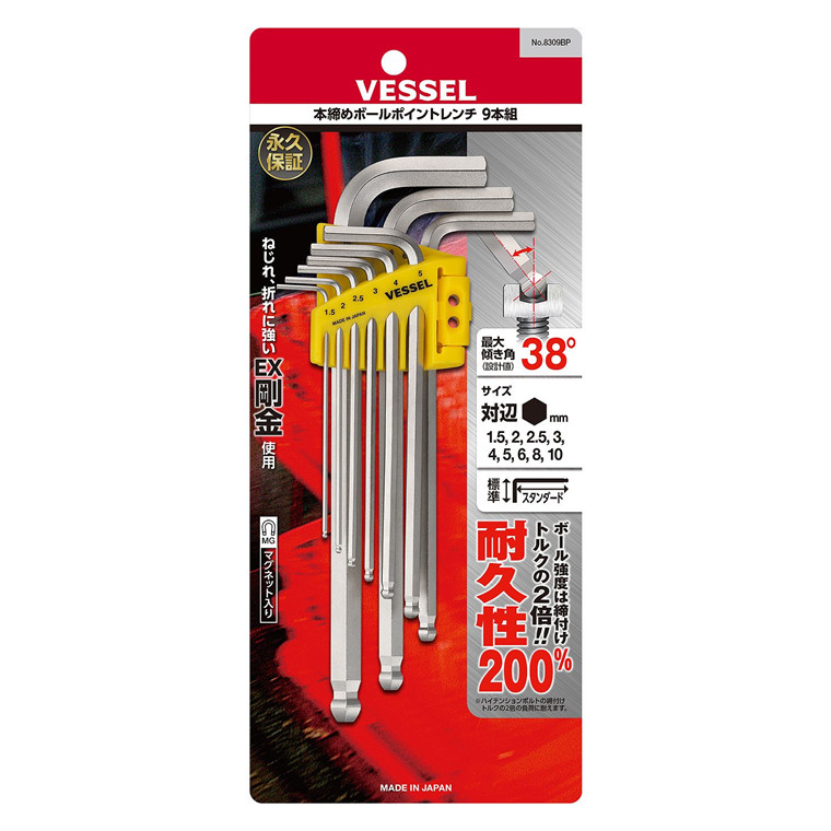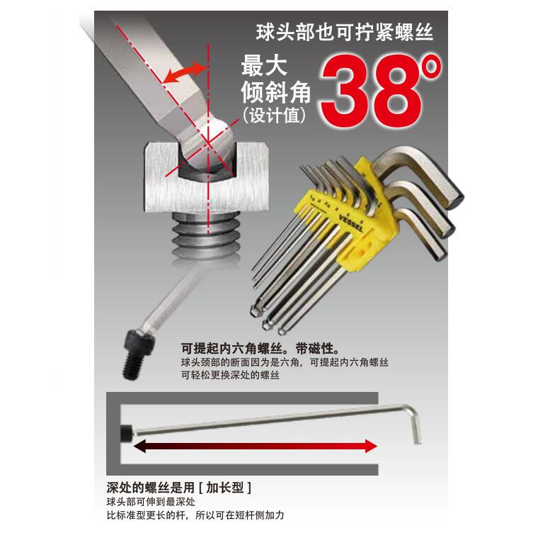 ●可用于紧固的球头内六角扳手。 ●钢材"EX钢金"(整体热处理,内置磁铁)日本产。 ●可从侧部插入快速转动。 ●最大倾斜度38度(设计值)。