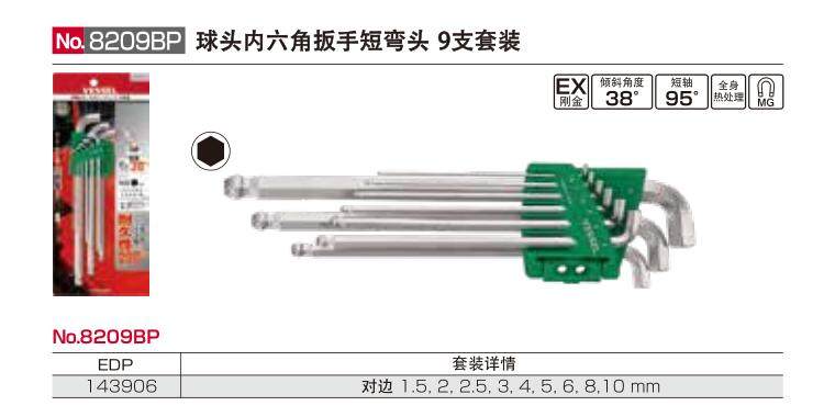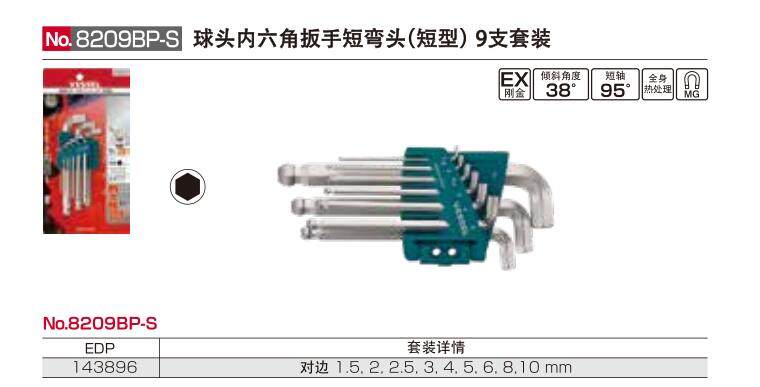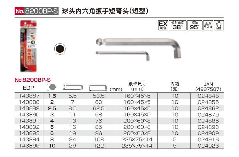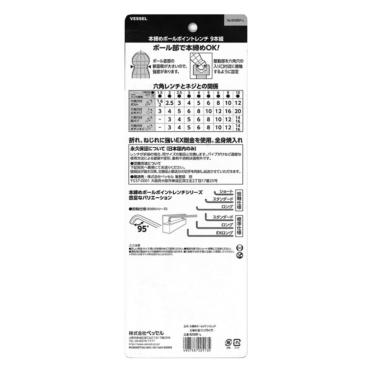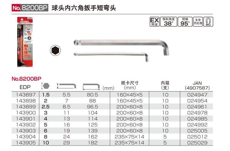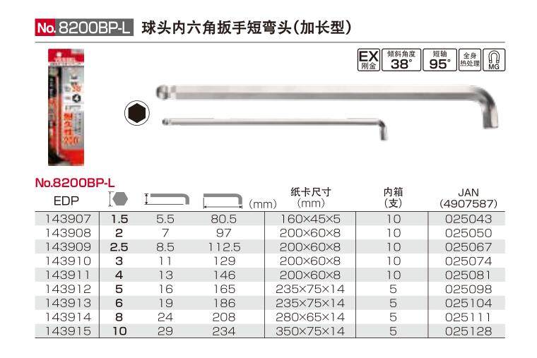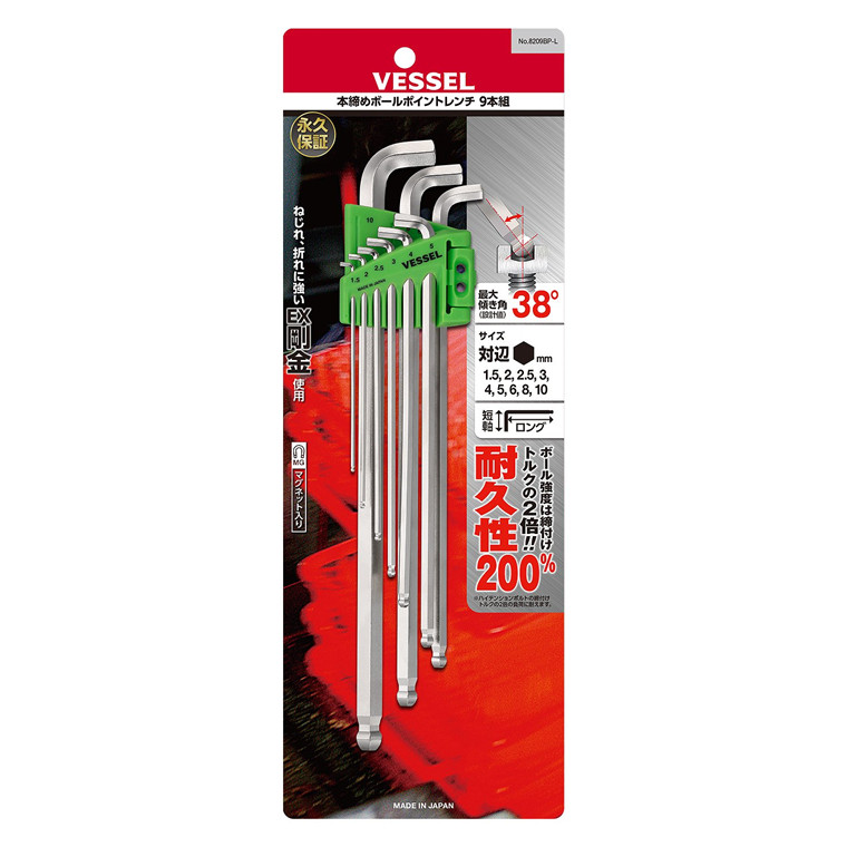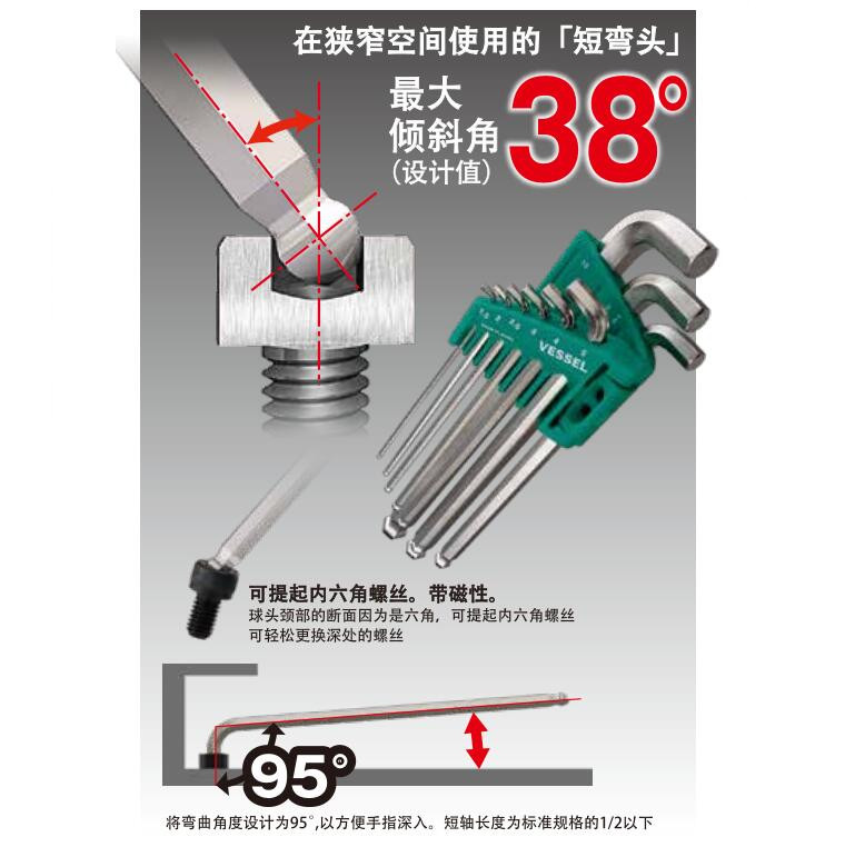 ●可用于紧固的球头内六角扳手。 ●钢材"EX钢金"(整体热处理,内置磁铁)日本产。 ●可从侧部插入快速转动。 ●最大倾斜度38度(设计值)。 ●便于在狭窄处操作,为保证手指活动空间,弯曲角度设定为95度。