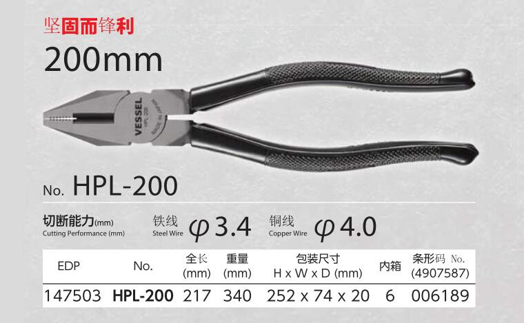 日本 VESSEL威威工具6寸7寸8寸钢丝钳老虎钳 HPL-150/175/200