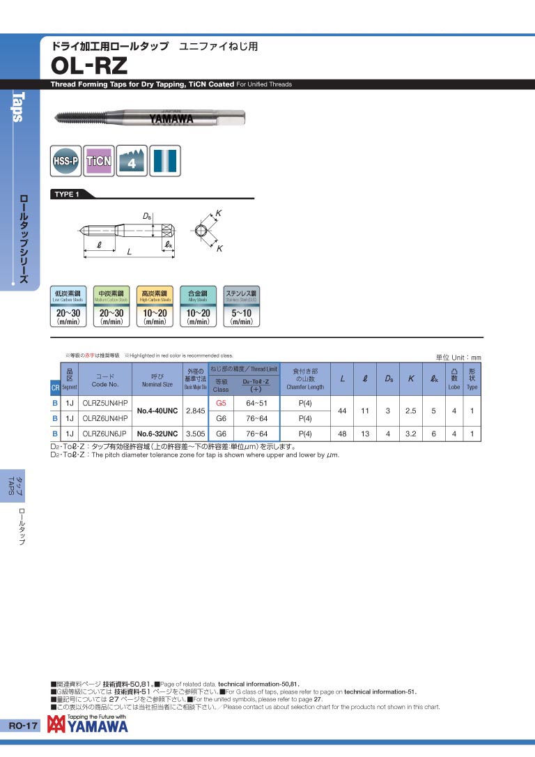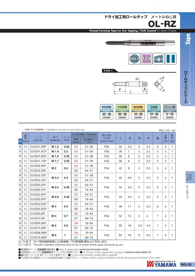 螺丝攻精度等级: YAMAWA G级 (有加大精度可供选择)