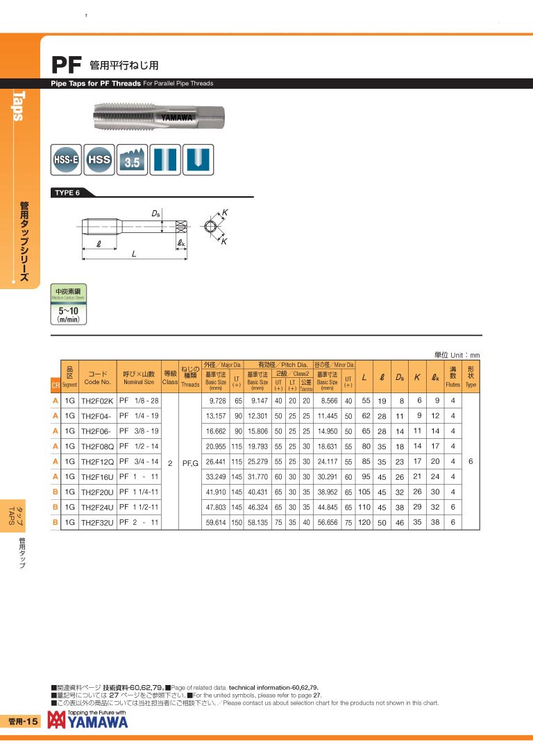 日本 YAMAWA 直槽式日标直牙管用平行丝攻 PF