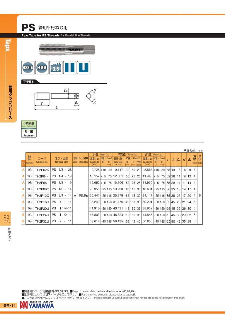 日本 YAMAWA 直槽式日标锥度牙用管用平行丝攻 PS