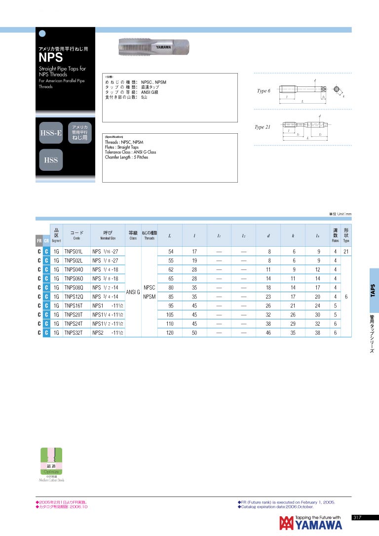 日本 YAMAWA 直槽式美标锥度牙用管用平行丝攻 NPS