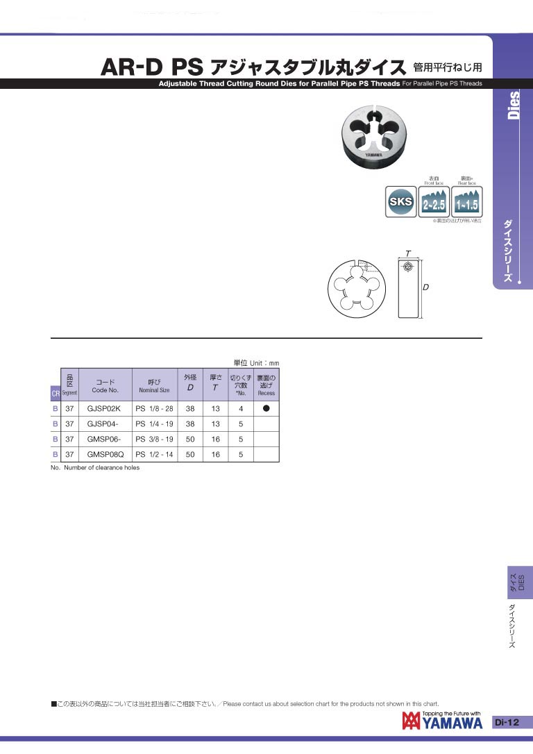日本 YAMAWA 日标锥度牙管用平行板牙 AR-D PS