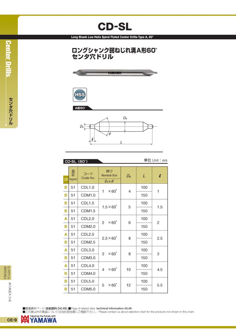 日本 YAMAWA 60°长柄低螺旋沟中心钻 CD-SL