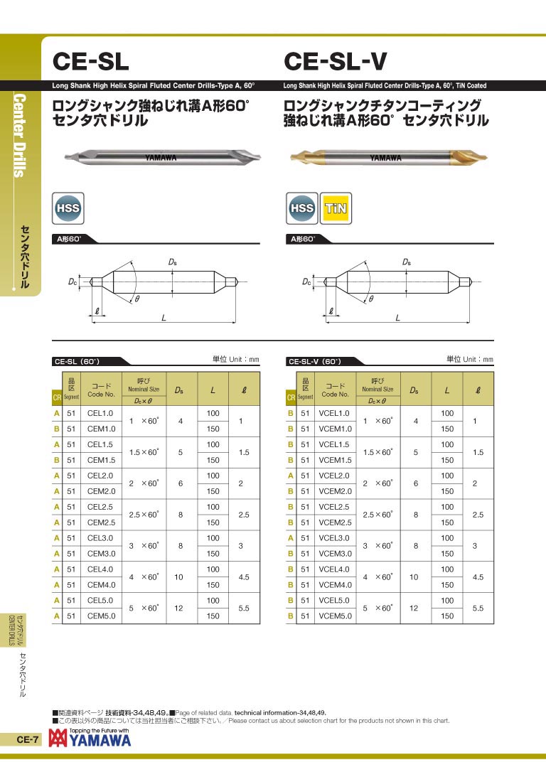 日本 YAMAWA 镀钛60°长柄高螺旋沟中心钻 CE-SL-V